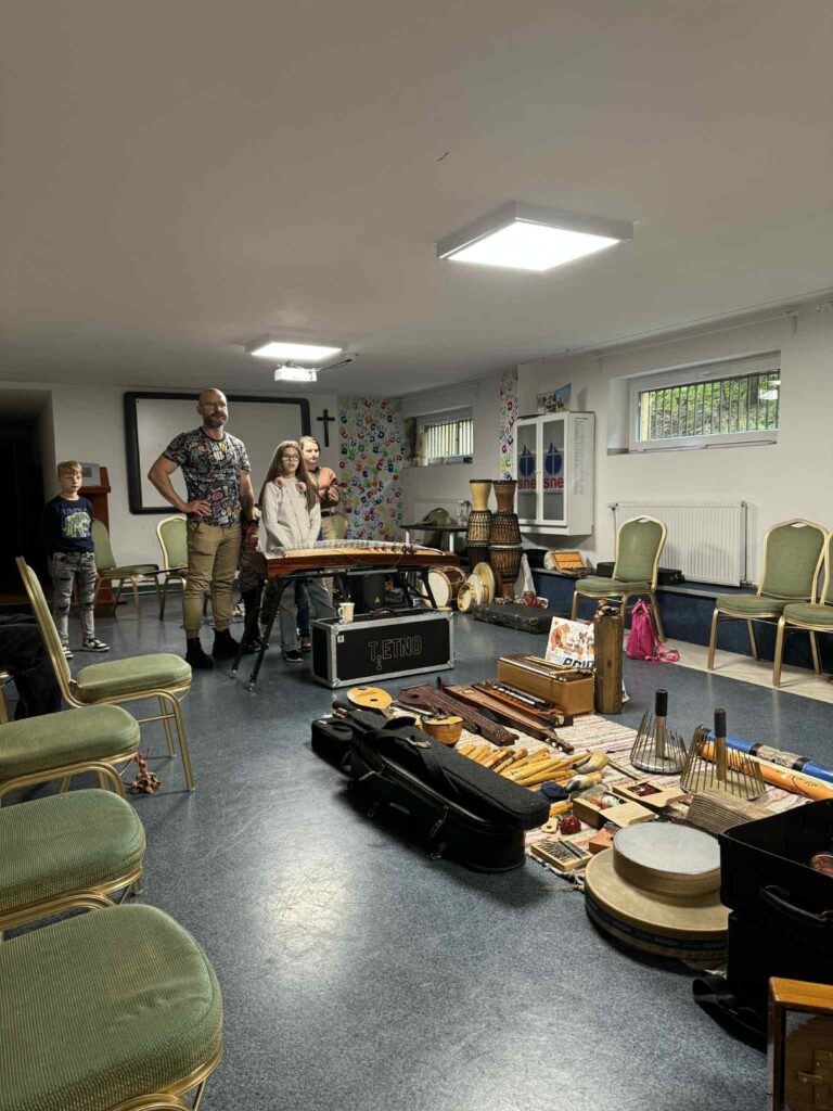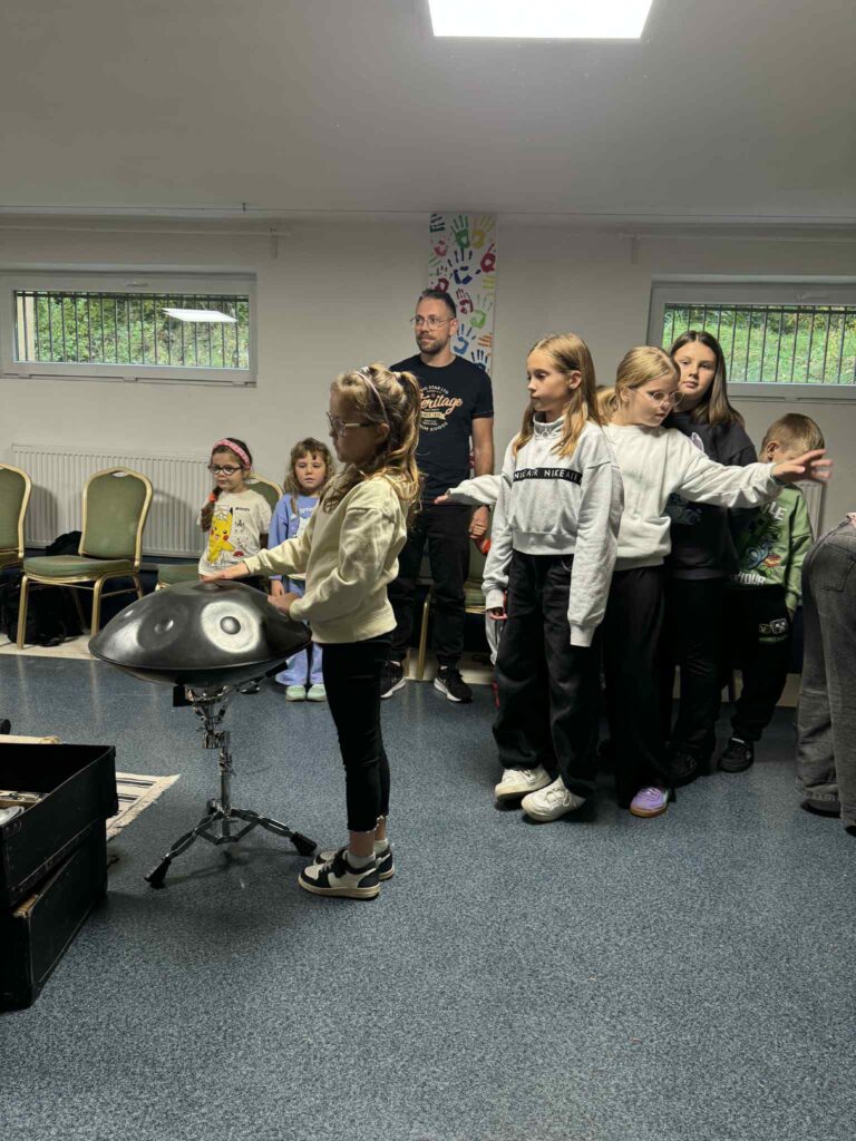 Podczas tego muzycznego spotkania zarówno dzieci, jak i dorośli mogli poznać, a następnie spróbować swoich sił w grze na nietypowych instrumentach. Tomek pokazał również, że grać można dosłownie na wszystkim – nawet na… rurce PVC, którą wspólnie wykonaliśmy.